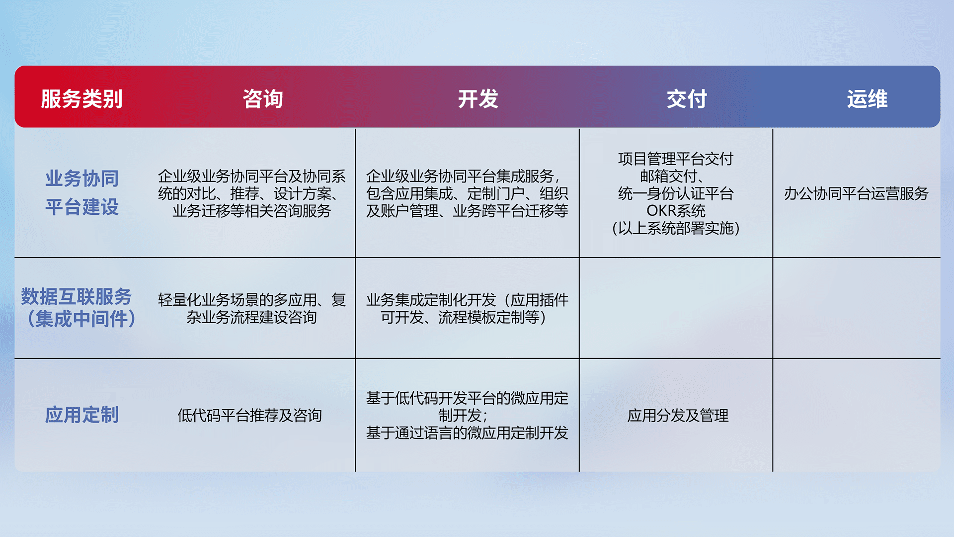 针对钉钉、、、、企微、、IDaas等平台级产品提供产品的规划、、、、方案、、交付、、定制化开发等服务,,,实现如统一协同办公、、、智能客户服务、、混合会议管理、、智能数据查询、、、、等业务场景,,,实现数字化转型。。。。