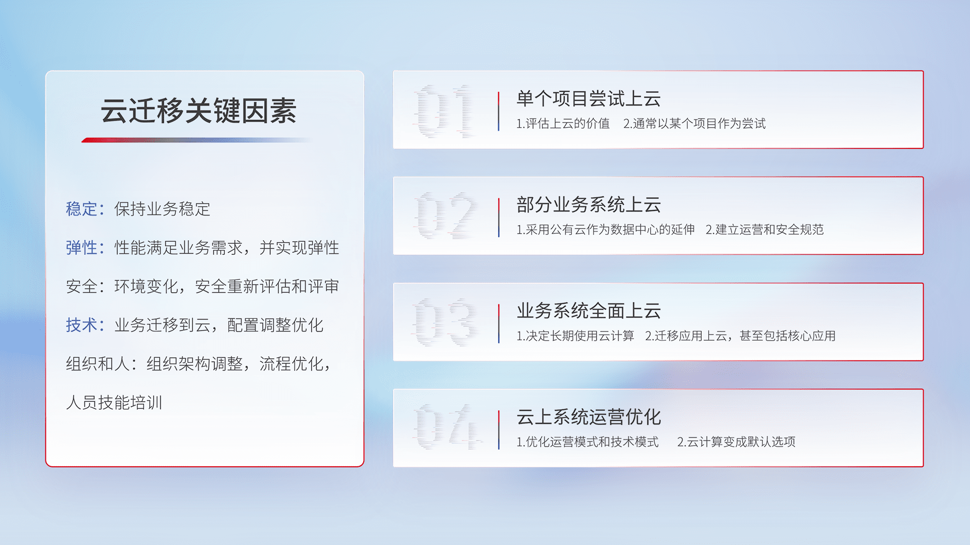结合实际业务,,从规划设计、、、、云平台选型、、、云原生改造、、、数据迁移、、、集成交付,,,,迁移全过程为客户识别最佳上云路径,,做好风险识别管理,,,设计网络架构、、、、身份权限、、、、安全审计合规、、、、操作审计、、日志审计、、、、监控告警策略、、、、多站点容灾设计等,,对云上基础设施进行整体规划,,,提升IT治理水平,,以满足弹性、、、高可用、、高性能的需求。。