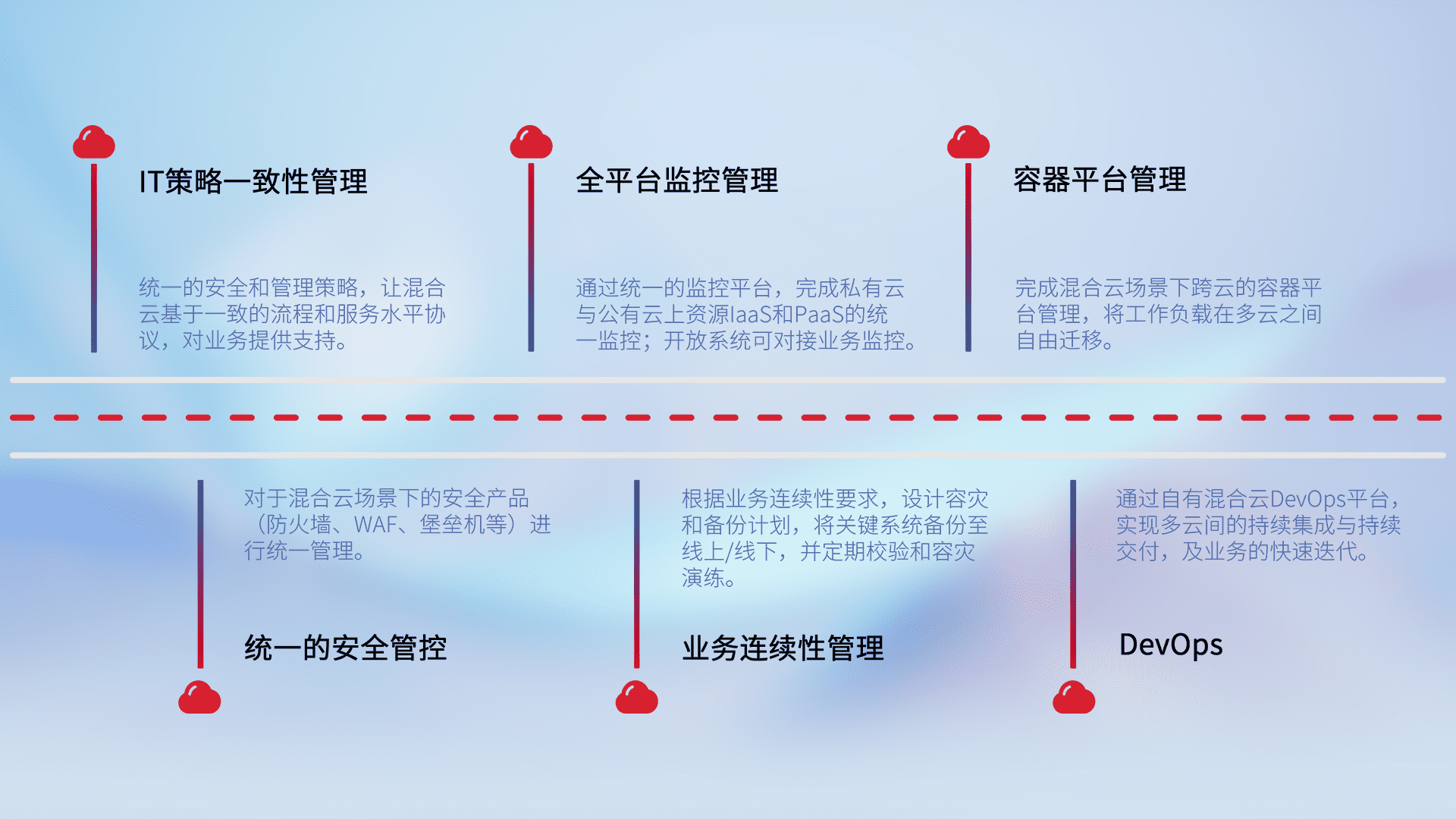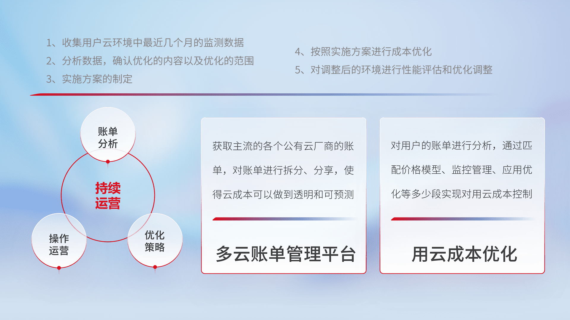 通过多云纳管,,以统一的资源数据模型把客户的云资源进行抽象和封装,,进而实现对多云资源的统一操作,,保障云资源管理的可靠性、、、稳定性与可用性。。。。量身定制化运维内容,,,配置、、、、开发运维、、补丁管理、、备份、、监控、、、认证和访问管理、、、审计和日常巡检等,,,,保障在用云过程中的可靠度,,稳定度以及高可用率。。。